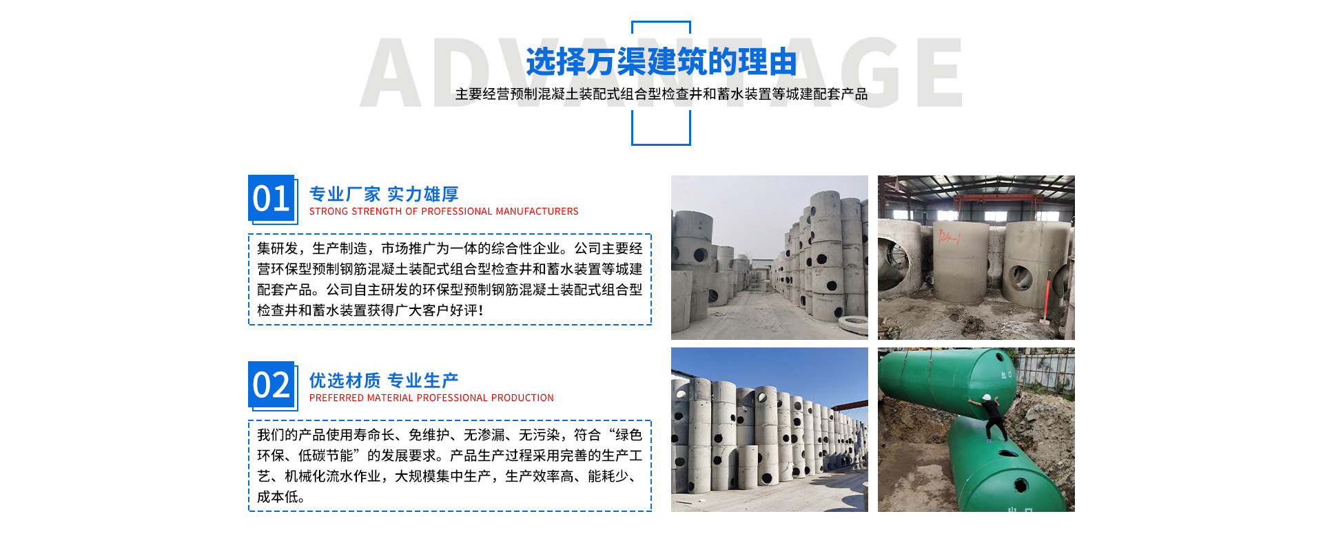 安徽萬渠建筑科技有限公司是集研發,生產制造,市場推廣為一體的綜合性企業。公司主要經營環保型預制鋼筋混凝土裝配式組合型檢查井和蓄水裝置等城建配套產品。產品生產過程采用獨特的生產工藝,機械化流水作業。產品大規模生產,生產效率高,耗能少,成本低,產品使用壽命長、免維護、無滲漏、無污染,符合“綠色環保,低碳節能”的發展要求,是傳統磚砌井池的理想替代產品。